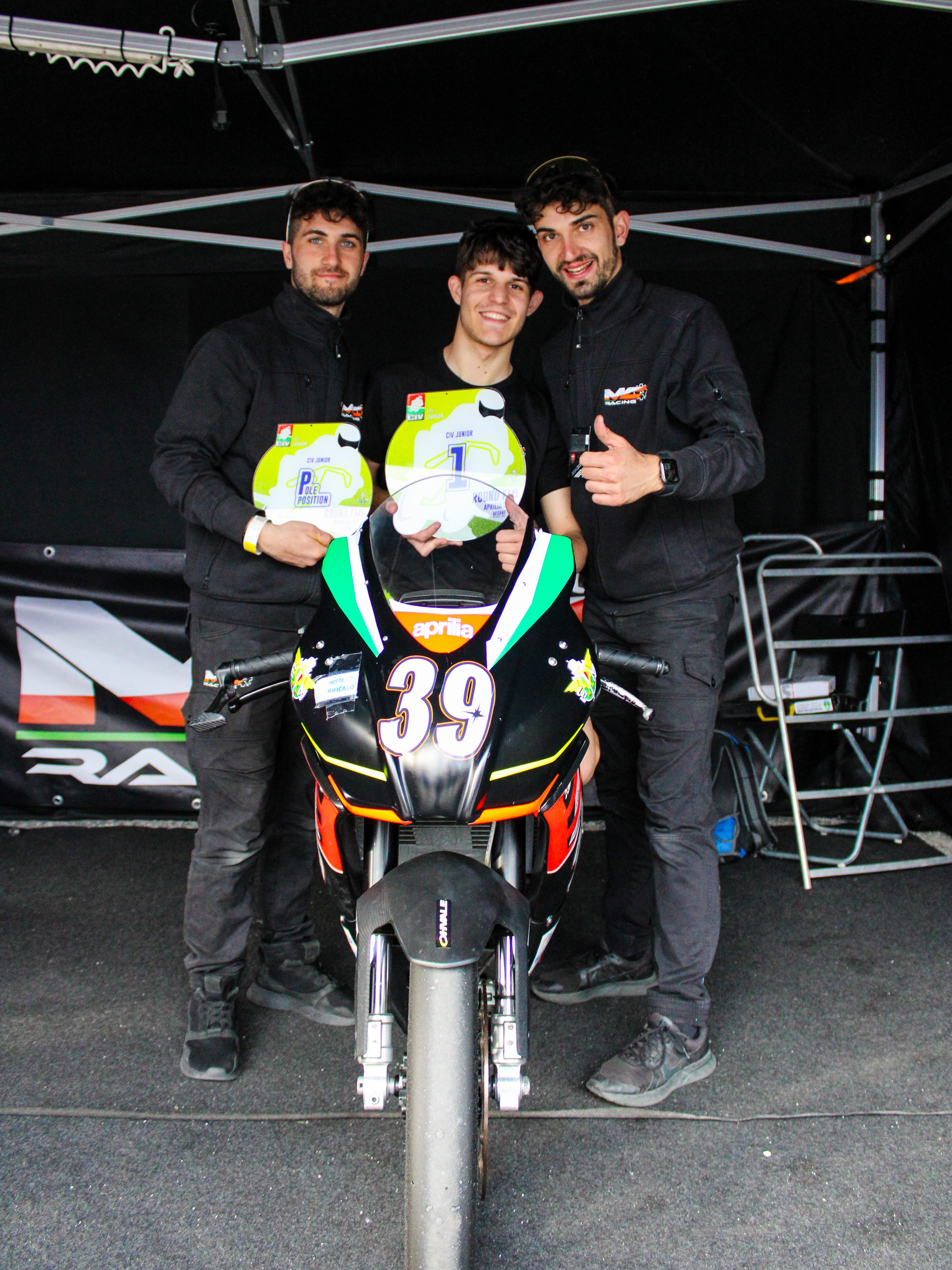 Durante l’inverno successivo ho lavorato molto per arrivare in forma alla stagione 2024, sempre nel CIV con l’Aprilia 250. Grazie anche all’ottimo lavoro del MC Racing, il mio nuovo team, ho iniziato l’anno con un exploit al Misano World Circuit: pole position e vittoria al fotofinish!